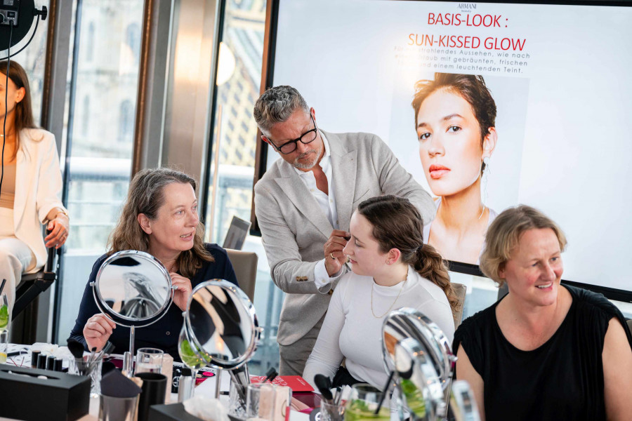 Bei einer exklusiven ARMANI Masterclass – unter der Schirmherrschaft von KURIER Freizeit Trendexpertin Isabella Klausnitzer – konnten sieben Mutter/Tochter-Paare mehr über den berühmten ARMANI-Glow erfahren. Schrittweise führte sie Make-up Artist Michael Latus mit seinem Team zum natürlichen Sommerlook.