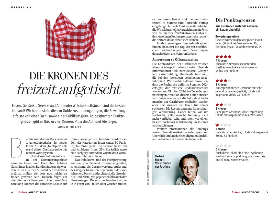Zum zweiten Mal erscheint der Gasthaus-Guide der KURIER freizeit: Rund 300 Lokale sind nominiert und werden in den vier Kategorien Essen, Getränke, Service und Ambiente bewertet – einerseits von der freizeit-Community auf freizeit.at und andererseits von einem Expertengremium. Die Gesamtergebnisse sind im gedruckten Werk ,freizeit.AUFGETISCHT‘ zu finden. Es soll Inspiration sein für alle Genießer und Freunde des klassischen österreichischen Gasthauses, das wir alle ja so lieben.
