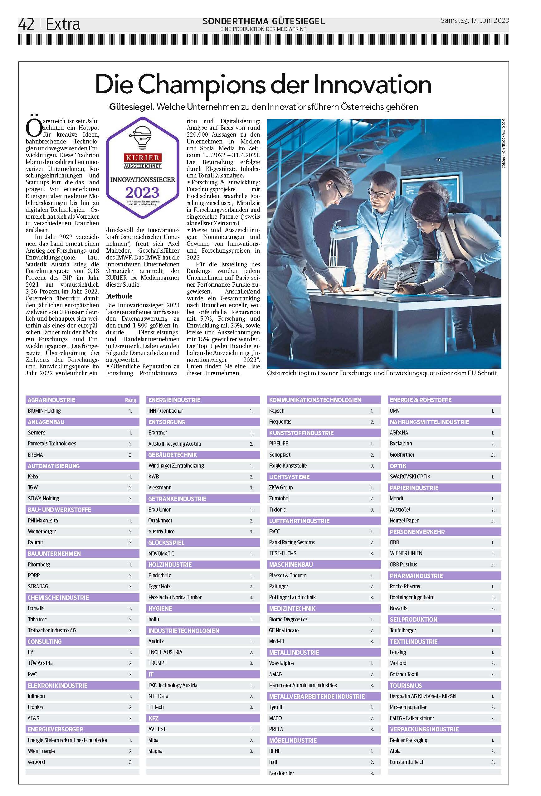 „Die fortgesetzte Überschreitung des Zielwerts der Forschungsund Entwicklungsquote im Jahr 2022 verdeutlicht eindrucksvoll die Innovationskraft österreichischer Unternehmen“, freut sich Axel Maireder, Geschäftsführer des IMWF. Das IMWF hat die innovativsten Unternehmen Östereichs ermittelt, der KURIER ist Medienpartner dieser Studie.