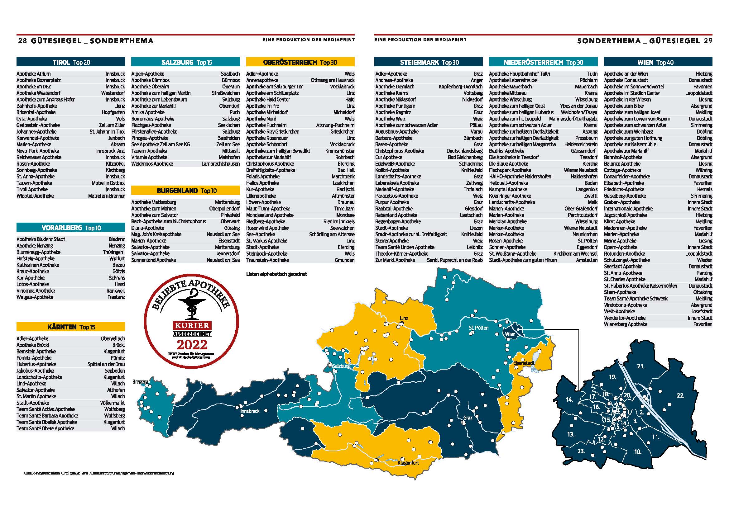 Durchgeführt wurde die Erhebung von IMWF Austria Institut für Management- und Wirtschaftsforschung. Der KURIER ist Medienpartner des Gütesiegels. „Die Auszeichnung beruht auf einer umfassenden Studie zu allen rund 1.400 Apotheken in Österreich“, erklärt Axel Maireder, Geschäftsführer des IMWF Austria. Die Beliebtheit der Apotheken wurde dabei an Hand aller online zur Verfügung stehenden Indikatoren gemessen: Anzahl Sterne und Anzahl Bewertungen zu den Apotheken auf Bewertungsplattformen, Kommentare zu den Apotheken auf Bewertungsplattformen, Anzahl Follower und Likes auf den Facebook-Seiten der Apotheken, Anzahl Follower und Likes auf den Instagram-Seiten der Apotheken, Nutzung weiterer Social Media Kanäle (z.B. Youtube, LinkedIn, Pinterest). Insgesamt wurden knapp 700.000 Datenpunkte ausgewertet.