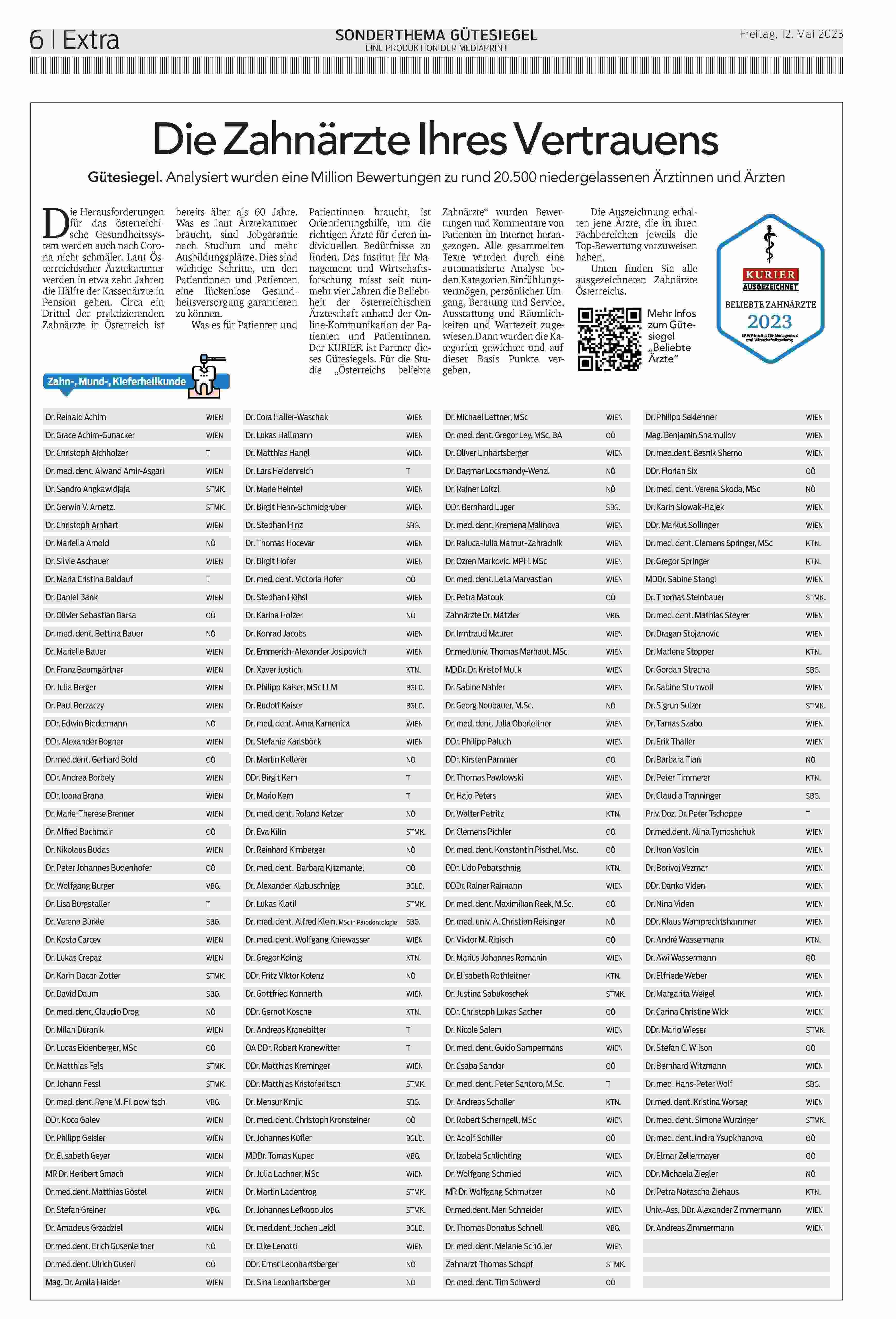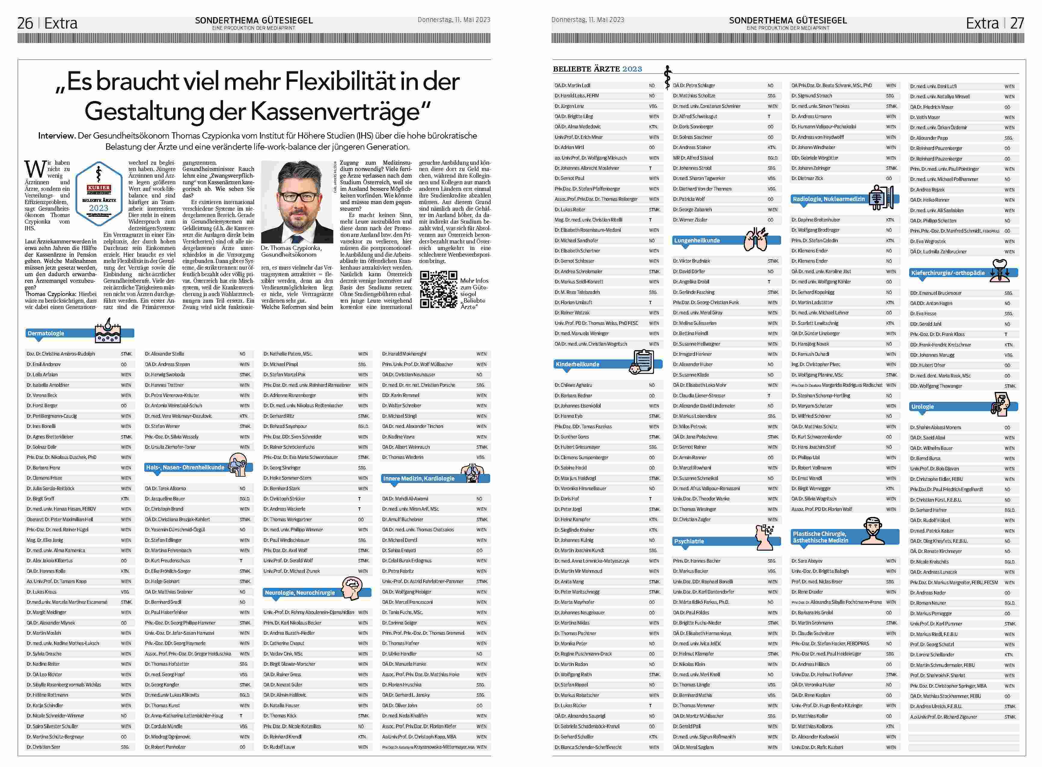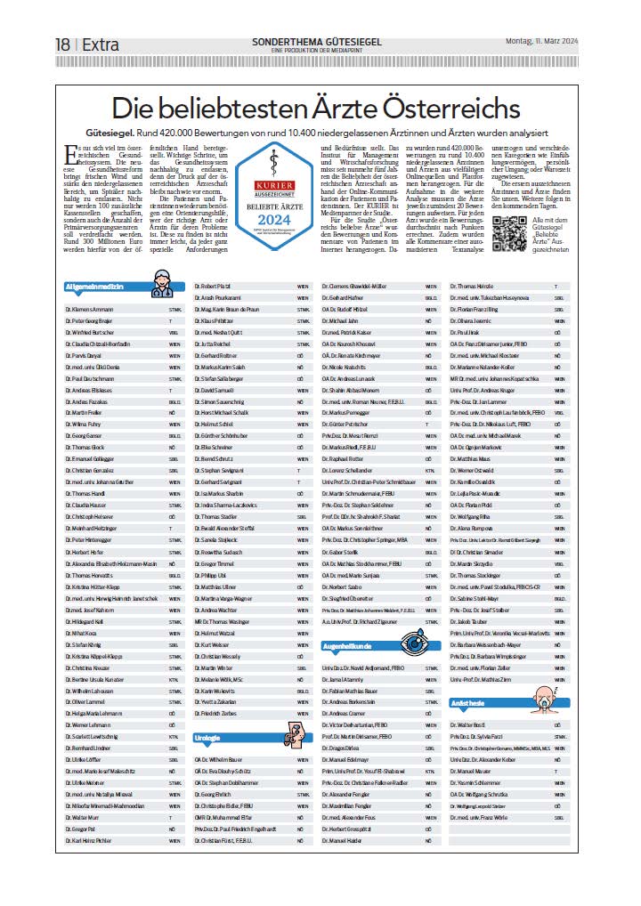 Was es für Patienten und Patientinnen braucht, ist Orientierungshilfe, um die richtigen Ärzte für deren individuellen Bedürfnisse zu finden. Das Institut für Management und Wirtschaftsforschung misst seit nunmehr vier Jahren die Beliebtheit der österreichischen Ärzteschaft anhand der Online-Kommunikation der Patienten und Patientinnen. Der KURIER ist Partner dieses Gütesiegels.