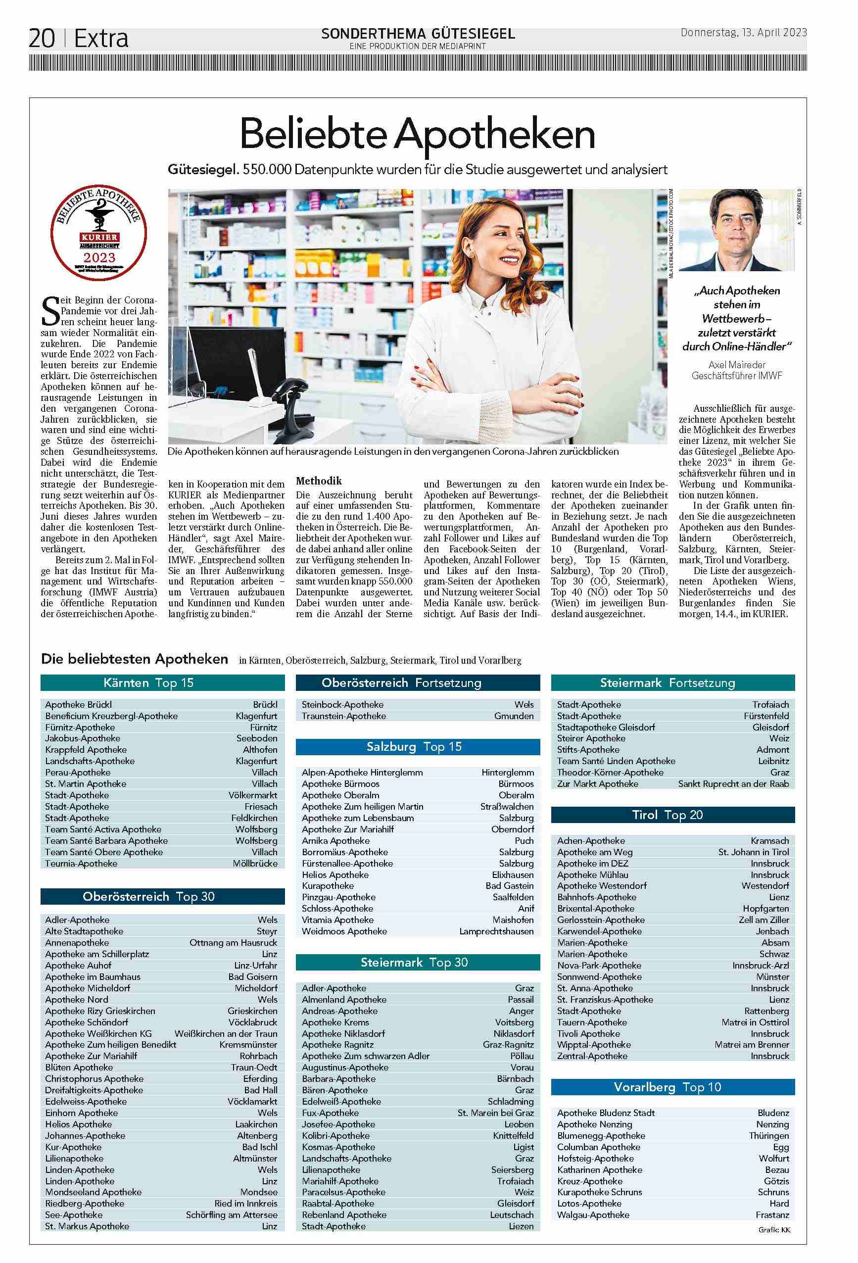 Durchgeführt wurde die Erhebung von IMWF Austria Institut für Management- und Wirtschaftsforschung. Der KURIER ist Medienpartner des Gütesiegels. „Die Auszeichnung beruht auf einer umfassenden Studie zu allen rund 1.400 Apotheken in Österreich“, erklärt Axel Maireder, Geschäftsführer des IMWF Austria. Die Beliebtheit der Apotheken wurde dabei an Hand aller online zur Verfügung stehenden Indikatoren gemessen: Anzahl Sterne und Anzahl Bewertungen zu den Apotheken auf Bewertungsplattformen, Kommentare zu den Apotheken auf Bewertungsplattformen, Anzahl Follower und Likes auf den Facebook-Seiten der Apotheken, Anzahl Follower und Likes auf den Instagram-Seiten der Apotheken, Nutzung weiterer Social Media Kanäle (z.B. Youtube, LinkedIn, Pinterest). Insgesamt wurden knapp 700.000 Datenpunkte ausgewertet.