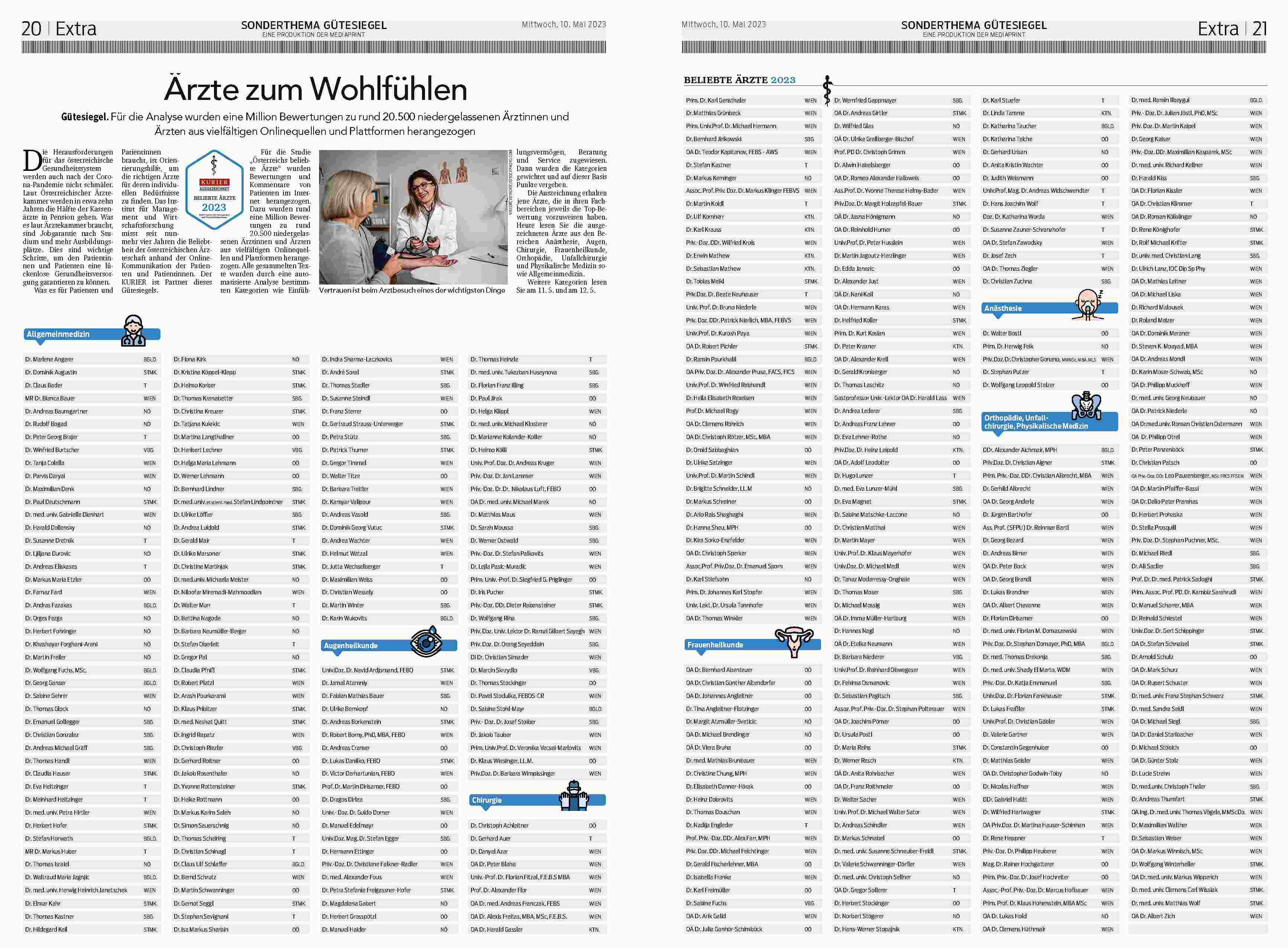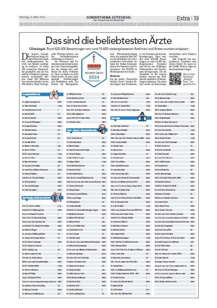 Was es für Patienten und Patientinnen braucht, ist Orientierungshilfe, um die richtigen Ärzte für deren individuellen Bedürfnisse zu finden. Das Institut für Management und Wirtschaftsforschung misst seit nunmehr vier Jahren die Beliebtheit der österreichischen Ärzteschaft anhand der Online-Kommunikation der Patienten und Patientinnen. Der KURIER ist Partner dieses Gütesiegels.