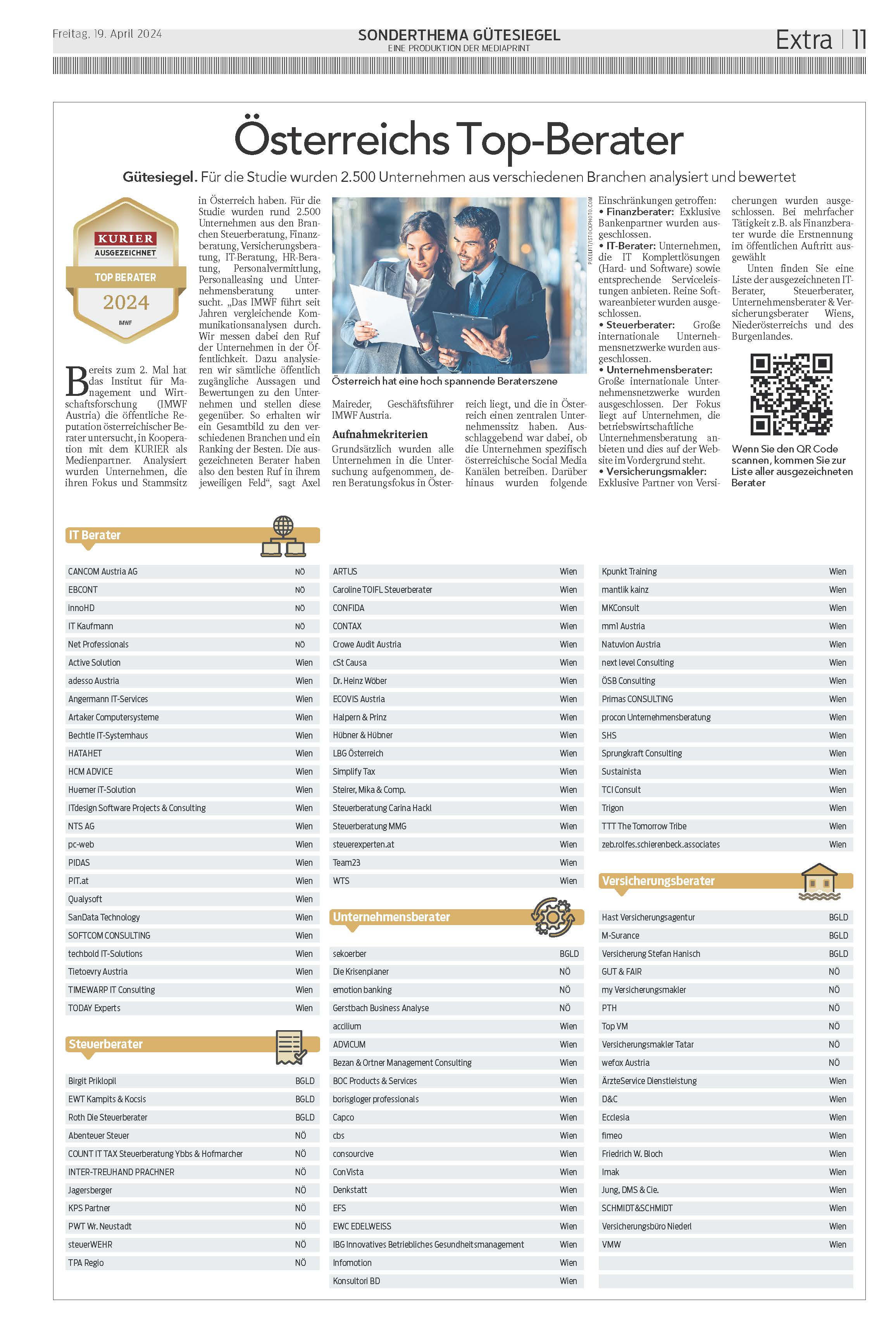 Das Institut für Management und Wirtschaftsforschung (IMWF Austria) hat die öffentliche Reputation der österreichischen Berater in den Kategorien Finanzberater, IT-Berater, Personalberater, Steuerberater und Versicherungsmakler erhoben.