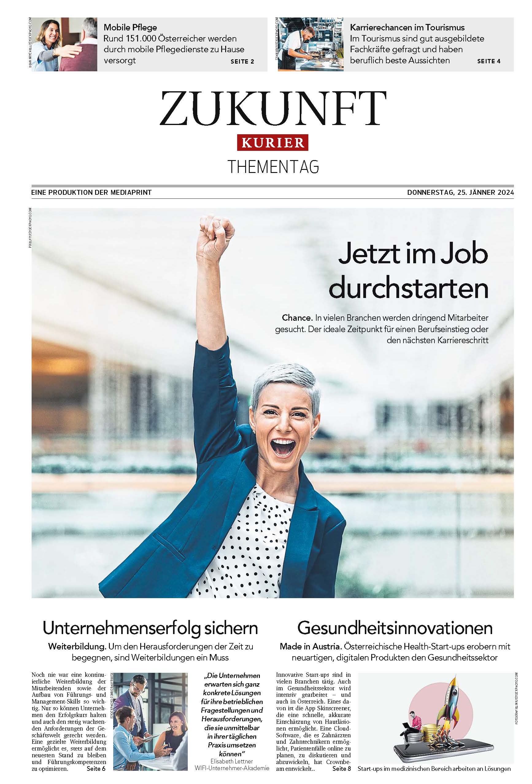 KURIER "Zukunft - Schwerpunkt Jobinitiative" ist eine Qualitätsplattform für Unternehmen, sich als Top-Arbeitgeber bei den überdurchschnittlich gebildeten KURIER-LeserInnen zu präsentieren. Das Special erscheint monatlich und crossmedial mit Themen wie Top Arbeitgeber, Lehrberufe, Frauen in der Technik, Nachhaltige Jobs, Berufe mit Zukunft und Aus- und Weiterbildung.
